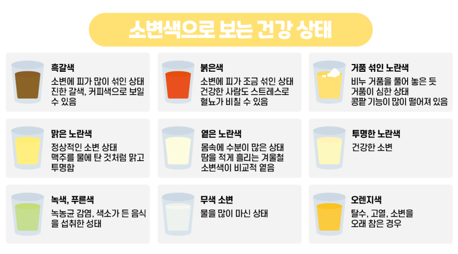 ![소변 색에 따른 질병 신호/ 출처 - 네이버포스트[국민건강보험일산병원]](https://blog.kakaocdn.net/dna/7U33I/btsMCzuhnxM/AAAAAAAAAAAAAAAAAAAAACVhYvR8CNaGR4xQkFGZYGPCpUZcCyI_mNp_lAWZVOHY/img.jpg?credential=yqXZFxpELC7KVnFOS48ylbz2pIh7yKj8&expires=1777561199&allow_ip=&allow_referer=&signature=wrBH%2FzGsBSb6tAiur8tZBV%2BSR2Y%3D)